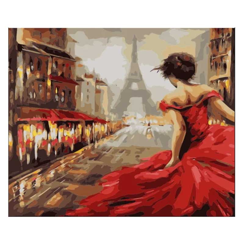 | Megnevezés | Számos festővászon keretben festékkel és ecsettel Piros ruhás nő Párizsban 30x40 cm (SZES391) |