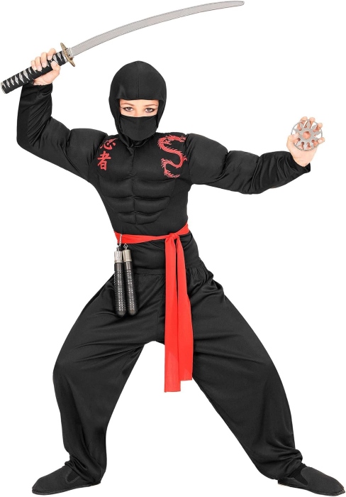 Gyerek ninja jelmez, puha poliészter anyagból, izgalmas harcos stílusú viselet farsangra, halloweenre vagy tematikus bulikra. A szett felsőrészt, nadrágot és jellegzetes részleteket tartalmaz, amelyekkel a gyermek gyorsan átváltozhat egy klasszikus ninja karakterré.