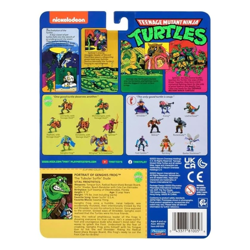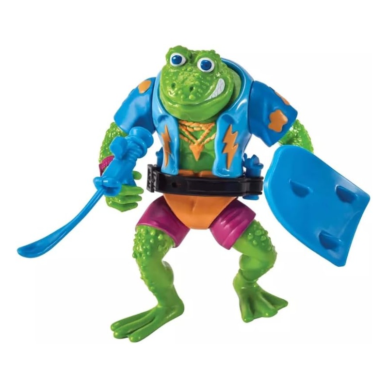 Ha a klasszikus, 80-as éveket idéző TMNT figurák hangulatát keresed, a Genghis Frog pont ilyen. Kb. 10 cm-es, 7 ponton mozgatható, és tele van a karakterre jellemző cuccokkal: jön hozzá a Tongue Gun, a boogie board, a vállas bandolier gránátos kiegészítő, plusz a Turtle Swatter, valamint levehető légy-szárnyak és karok. A csomagolás igazi retró: kártyás bliszter, az eredeti TMNT grafikás stílusban.