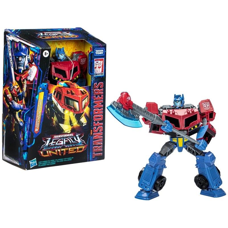 Optimus Prime a Transformers: Animated sorozatban is szereplő Autobot vezér. Ez a Legacy United Voyager Class kiadás a sorozat stílusát idéző festéssel és formavilággal készült, robot módból teherautó módba alakítható 25 lépésben. A csomagban ion axe és lightbar kiegészítőt kapsz, amelyek mindkét módban rögzíthetők. Kb. 17,5 cm magas, sok ponton mozgatható, polcon és vitrinben is jól mutat.