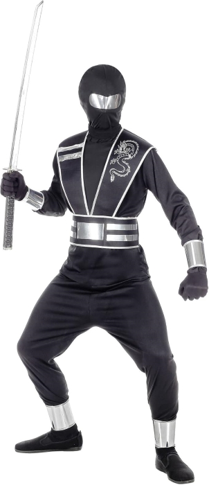 Gyerek ninja harcos jelmez szett, amely felsőből, nadrágból, páncélszerű résszel és övvel, valamint kiegészítő kar- és lábkötözőkkel áll össze. A viselet klasszikus harcos stílusú, sötét színvilágú, és gyors átváltozást tesz lehetővé farsangra, halloweenre vagy tematikus bulikra. Kényelmes, könnyen fel- és levehető anyagból készült, így ideális gyerek szerepjátékhoz.