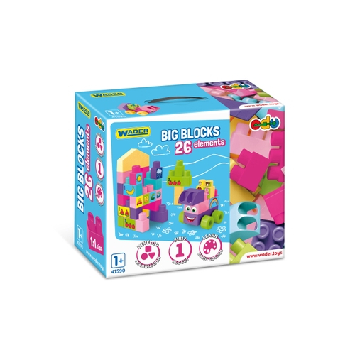 A Wader 41590 Big Blocks Pink a tökéletes építőkocka-készlet a kicsiknek, számtalan lehetőséget kínál a szórakoztató és kreatív építkezéshez. A készlet 26 többszínű, gyönyörű rózsaszín, lila, zöld, kék és vanília árnyalatú blokkból áll, amelyek tökéletesen illeszkednek a kis kezekbe. A különféle képeket, például számokat, betűket, karaktereket, állatokat és gyümölcsöket tartalmazó matricás lap további szórakozást és tanulást tesz lehetővé.