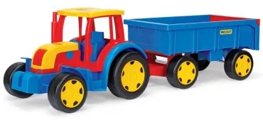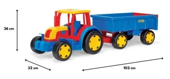 Ez a Wader Gigant 66100 traktor utánfutóval egy masszív, nagy méretű, ráülős munkagép-játék, amely mozgatható rakodóval és levehető utánfutóval teszi lehetővé a valósághű szerepjátékot, így a gyerekek homokot, játékokat vagy kisebb tárgyakat szállíthatnak vele, miközben fejlődik a kreativitásuk, egyensúlyérzékük és mozgáskoordinációjuk. A robusztus kialakítás miatt kültéri és beltéri használatra is ideális, igazi "mini munkagép" élményt nyújt. Mérete: a játék kb. 102 x 36 x 32 cm, a csomagolás kb. 32 x 47 x 55 cm. Anyaga: erős, időjárásálló műanyag, amely bírja az aktív, mindennapos használatot is. Teherbírás: a traktor akár 100 kg, az utánfutó kb. 60 kg terhelhetőséggel rendelkezik. Korosztály: 1-3 éves kortól ajánlott felügyelet mellett, de nagyobb gyerekek számára is ideális mozgásos, szerepjátékos élményt biztosít.