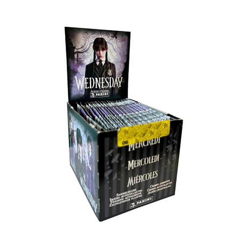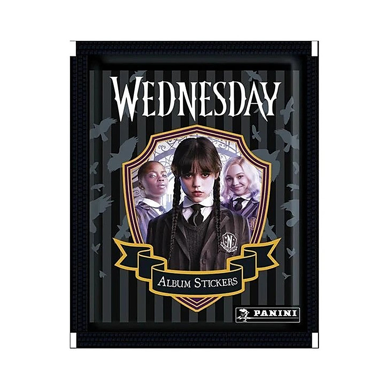 Hivatalos Panini gyűjtői matricacsomag a Wednesday sorozathoz. Egy tasak 5 db véletlenszerű matricát tartalmaz, amikkel lehet gyűjteni, cserélni, és megtölteni a hozzá tartozó albumot.