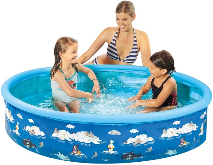 Ez a Wehncke Arctic Friends felfújható gyerekmedence ideális választás kerti vagy udvari nyári vízi játékhoz, amely stabil, erős falú kialakításának köszönhetően biztonságos és kényelmes pancsolási élményt nyújt kisebb gyermekek számára. A fix, nem felfújható peremmel kombinált szerkezet és a strapabíró PVC anyag hosszabb élettartamot és jobb stabilitást biztosít használat közben, miközben a vidám Arctic Friends mintázat játékos megjelenést ad. Méret: 155 cm átmérő és 30 cm magasság, amely több gyermek számára is alkalmas sekély vízi játékhoz. Anyag: tartós, phthalátmentes PVC műanyag, amely ellenáll a kültéri használatnak és könnyen tisztítható. Korosztály: 3 éves kortól ajánlott, kizárólag felnőtt felügyelete mellett használható. Gyorsan felállítható és leereszthető, így praktikus megoldás a nyári hűsöléshez és otthoni pancsoláshoz.