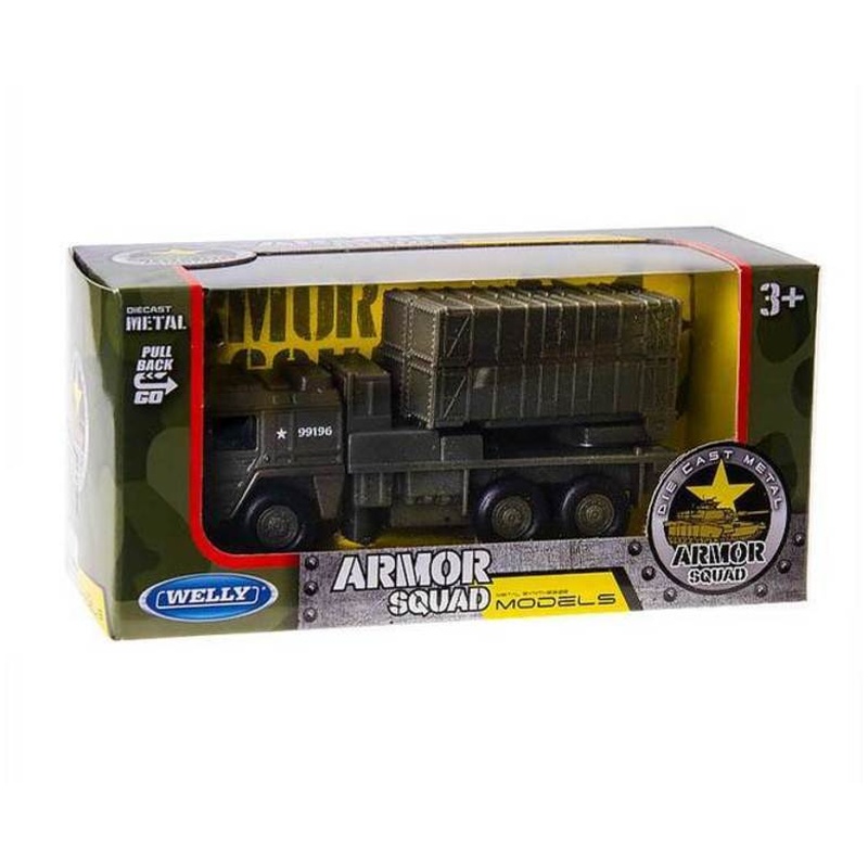 Welly Armor Squad rakéta sorozatlövő 1/34 méretarányban, fém és műanyag elemekből készült kivitelben. A felépítmény és a rakétás rész miatt látványos, a katonai járműves készletekben mindig különlegesebb darab, mint egy sima teherautó. Guruló kerekekkel készült, polcon és vitrinben is jól mutat, játékhoz pedig jó, mert a mérete kényelmes és könnyen mozgatható.