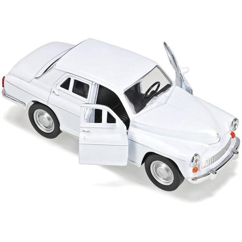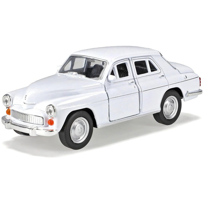 Welly Warszawa 224 fém modellautó 1/34-1/39 méretarányban, fehér színben. Guruló kerekekkel készült, a karosszéria és a klasszikus arányok jól adják vissza a korabeli kelet-európai limuzin hangulatát. Polcon egymás mellé téve más retró modellekkel nagyon jól mutat, játékhoz pedig kényelmes, mert stabilan gurul és jól kézben tartható.