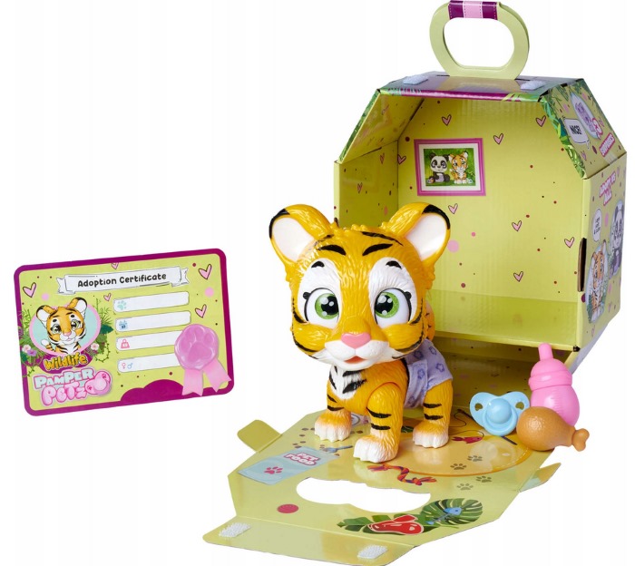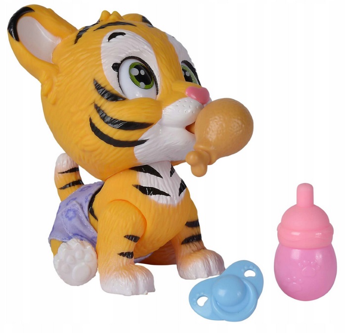 Ez egy Simba Pamper Petz sorozatú interaktív játékfigura tigris-bébi, amely kb. 15 cm magas, és gyerekeknek készült. A tigris nagy szemű, műanyag figura, amelynek része egy trink- és "pisi" funkció: a játék igazi vízzel itatható, és a pelenka nedvesség hatására sárgára változik. A csomag három kiegészítőt és egy örökbefogadási okmányt is tartalmaz a gondozás játékos élményéhez. A figura a "Pamper Petz" kollekció része, amelyben a gyerekek állat-bébiket nevelhetnek, etethetnek és gondozhatnak játék közben, fejlesztve a felelősségérzetet és a szerepjátékos készségeket.