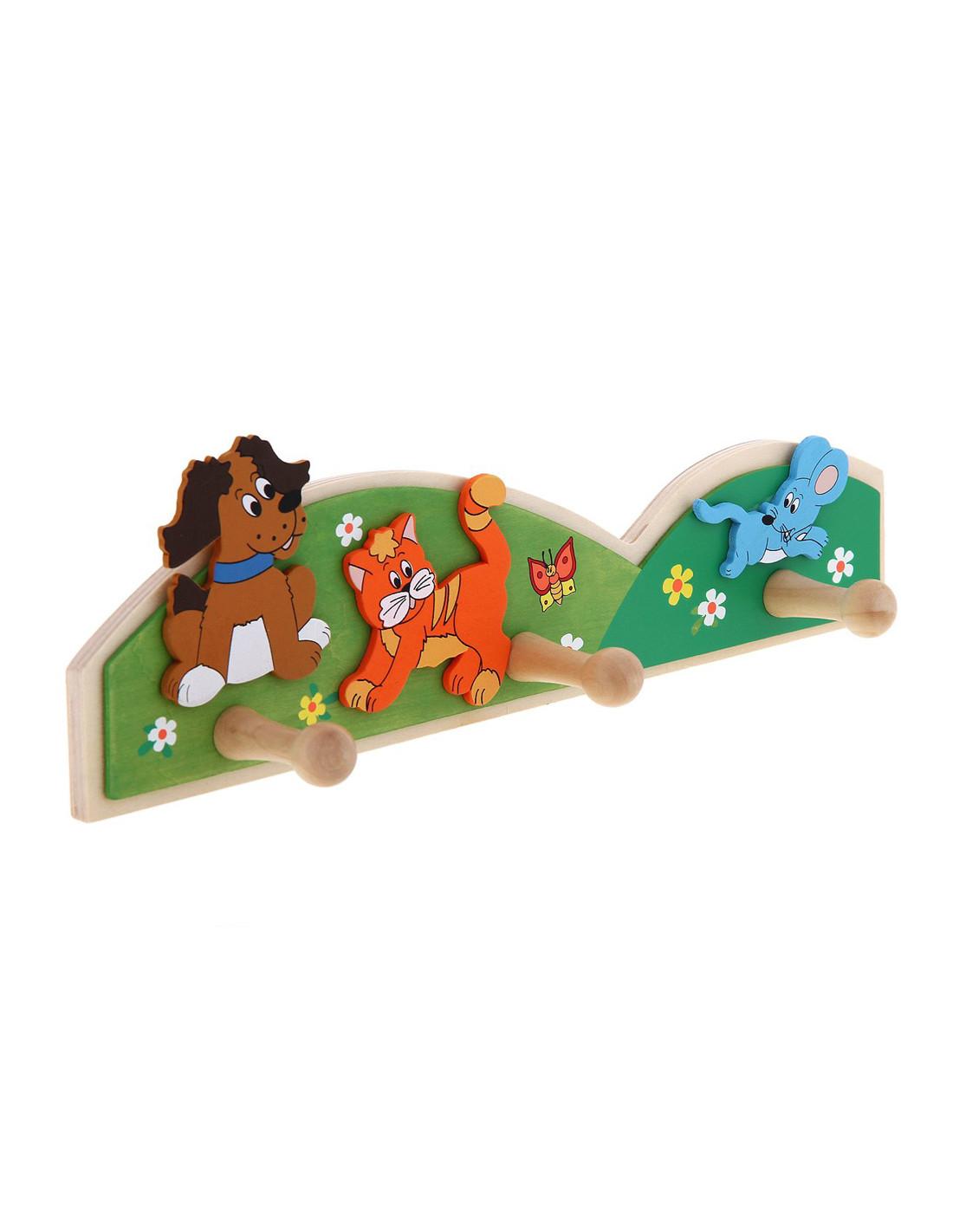 Erre a gyönyörű állatos, fa fogasra öröm lesz felakasztani a kabátot, hisz a kutya, a cica és az egér mindig ott várnak majd vidám hangulatban! Fából készült fogas, 3 akasztóval a Woody-tól, kb. 29 x 9 cm-es méretben!