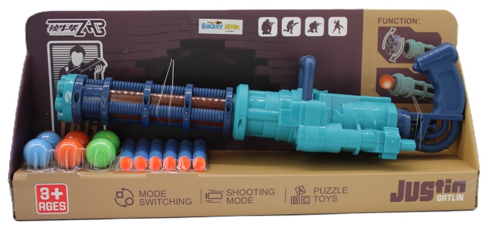 Ez a játék Gatling stílusú fegyver dinamikus szórakozást nyújt a gyerekeknek, hiszen kétféle töltényt is tud lőni: szivacslövedékeket és szivacslabdákat (a csomagban 6-6 darab mindkettőből). A fegyver 41 cm hosszú, könnyen kezelhető, gyerekbarát kialakítású darab, amely aktív játékra ösztönzi a gyerekeket és fejleszti a céllövő képességet. Anyag: tartós műanyag. Korosztály: 3 éves kortól ajánlott. Ez a szivacslövő játék ideális választás házi versengésekhez, udvari vagy beltéri játékhoz, miközben biztonságos és izgalmas élményt nyújt a gyerekeknek.